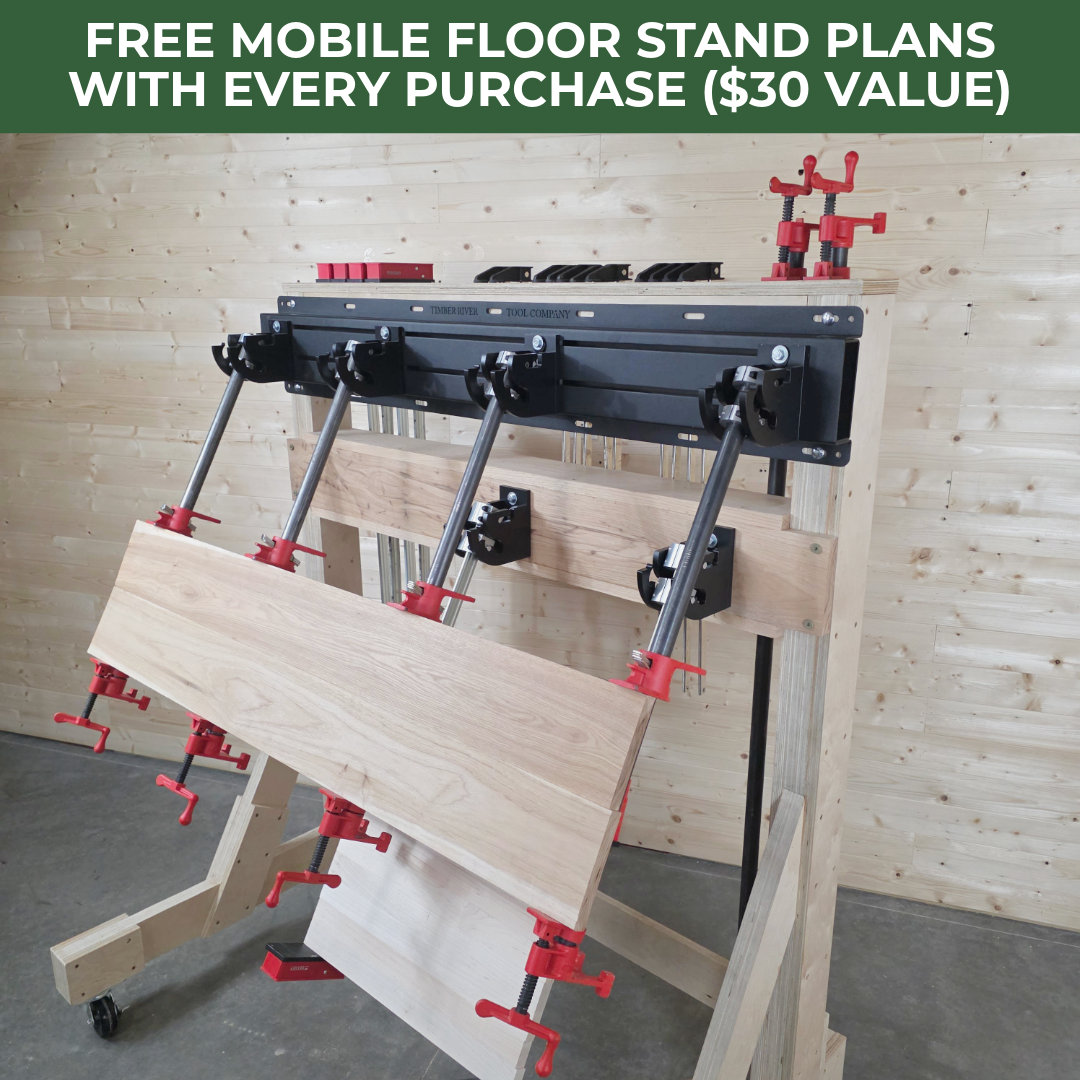 Turn any corner of your shop into a clamp station with our free mobile floor stand plans. Built from a single sheet of plywood with basic tools, it assembles in an afternoon, adds storage on the back for extra clamps, and brings all the benefits of our wall-mounted system to any space.